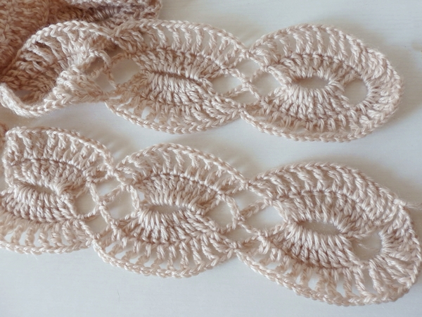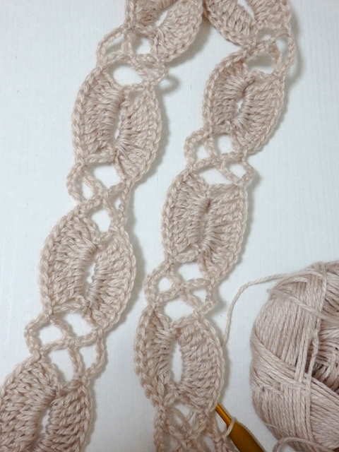 長々編みをチェーンに編み入れて、鎖編みで模様を隣につないでいきます。